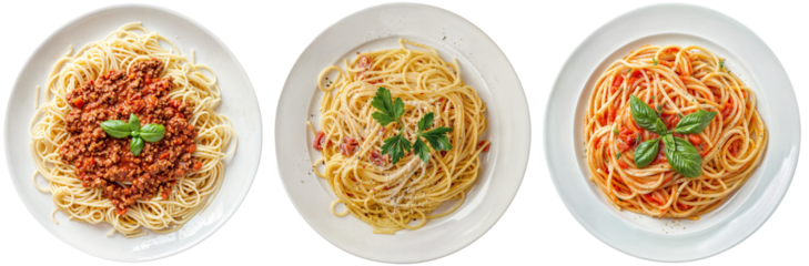 Spaghetti pasta collection, bolognese, carbonara and marinara in top view, isolated on a white background, italian food bundle