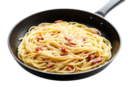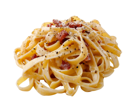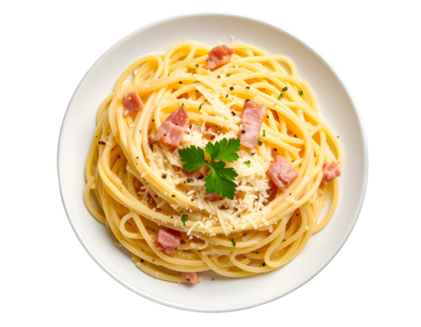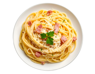 A plate of spaghetti carbonara with bacon and parmesan, Transparent background, PNG file