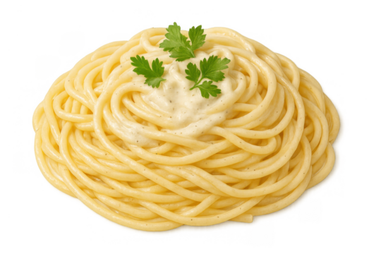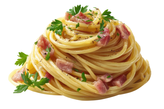 Spaghetti carbonara pasta with creamy sauce and parsley, an italian dish on transparent background