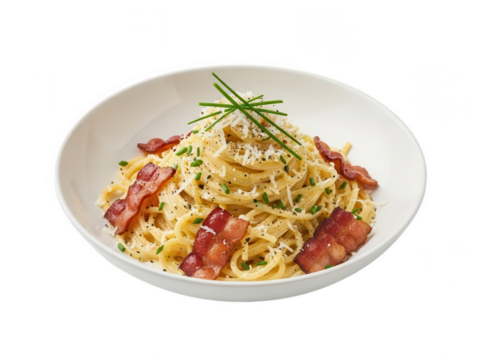 Spaghetti Carbonara with Bacon and Chives on White Background graphic