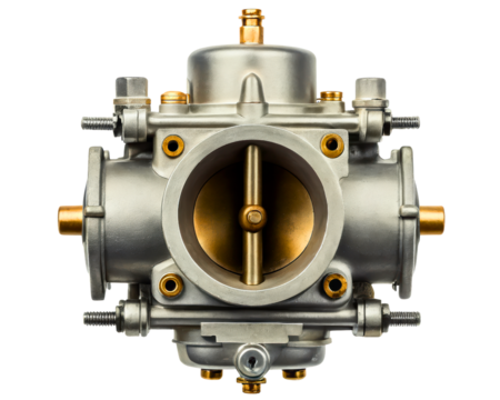 A sophisticated carburetor assembly of polished aluminum and brass, isolated on a transparent background with soft shadow. Concept of mechanical precision