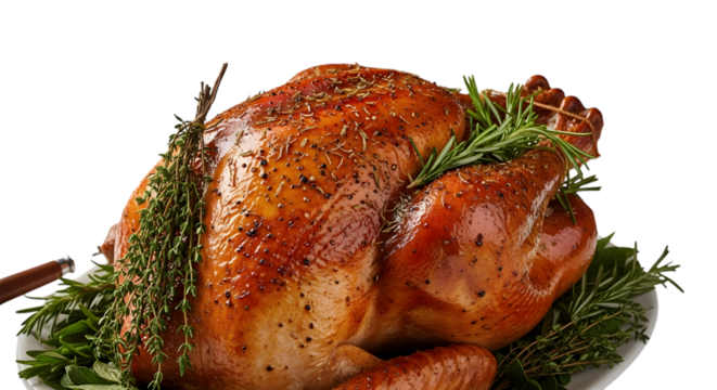 A delicious roasted chicken with herbs and spices, isolated on a transparent background, perfect for holiday feasts and culinary presentations