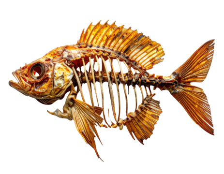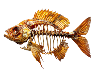 A complete, golden-hued fish skeleton. The intricate bone structure of its skull, spine, ribs, and fins are clearly visible.