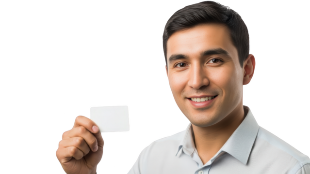 Man holding blank card smiling at camera