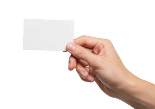 Hand holding blank white business card on transparent background