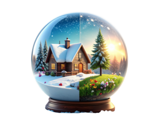 Snow Globe with Split Season Scene: Winter Christmas and Spring Garden, Transparent Background