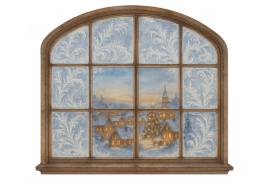 Snow globe showing cozy illuminated cottage during snowfall on transparent background