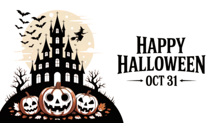 Spooky Halloween night with haunted house, pumpkins, and witch flying across the moon transparent PNG, isolated background