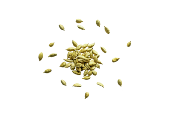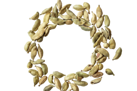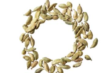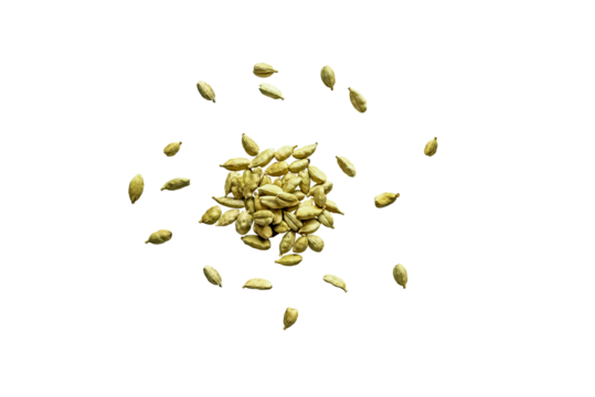 close-up of a pile of organic dry cardamom seeds isolated on a transparent background without shadow from above, top view, png