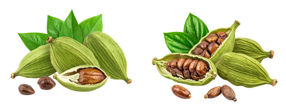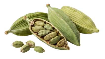 Green cardamom pods and seeds isolated on transparent background isolated on white background