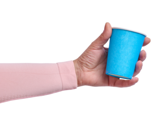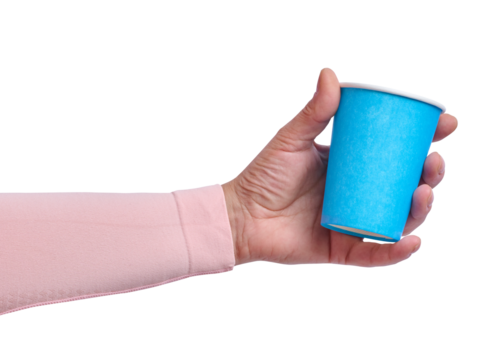 men's hands holding up disposable paper cups isolated on transparent and white background.PNG image.