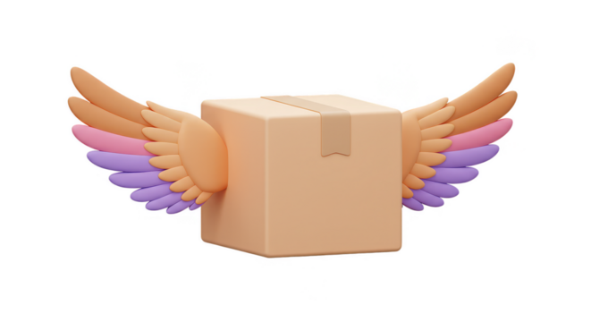 3D vector render illustration of a parcel box icon with white wings and a red location pin symbol on top. It conveys the concept of fast and accurate delivery of parcels to the specified location.