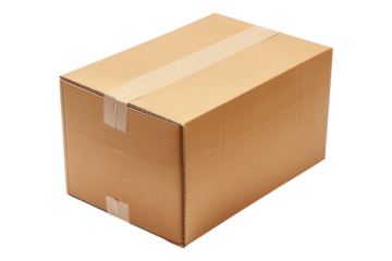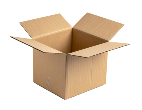 Open cardboard box isolated on transparent background, PNG. Moving, gift or parcel box with empty space.
