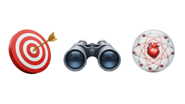 Target, Binoculars, and Scientific Heart Icon - Vision, Goal, and Medical Research Concept
