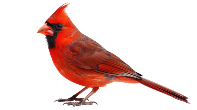 Vivid red Northern Cardinal bird perched, perfect for designs needing a transparent, png bird image on a white background