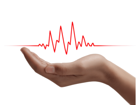 Human hand holding red heartbeat line on black background image, Isolated, Png Transparent Background
