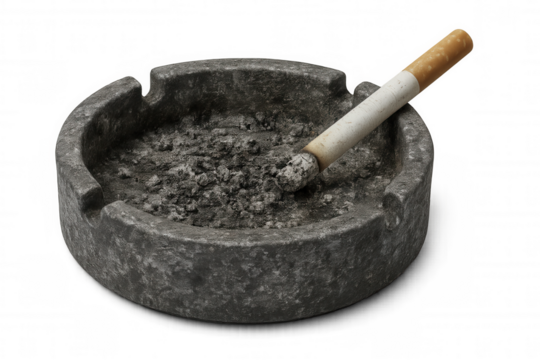 Smoldering cigarette balanced on overflowing ashtray, revealing tobacco addiction against isolated background