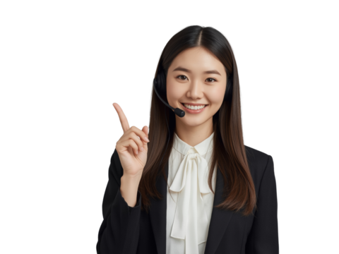 Friendly asian customer service agent providing assistance with her excellent work, isolated