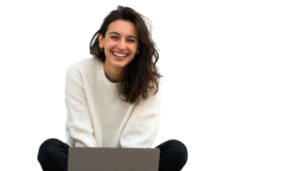 Young woman working remotely using laptop, enjoying flexibility and freedom of freelance career, on a transparent background