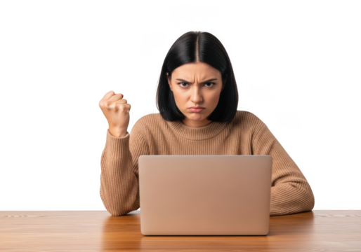 Frustrated woman working on laptop with angry expression, stress and deadline pressure, isolated on transparent background