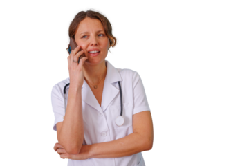 Female doctor talking on mobile phone, providing telehealth medical advice or making a professional call, transparent background