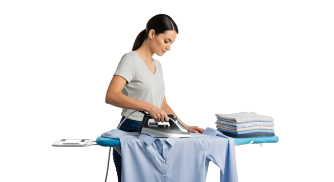 Ironing Clothes by a Domestic Worker, Home Setting, Photography, Minimalist Background, Focused View, Household Chores