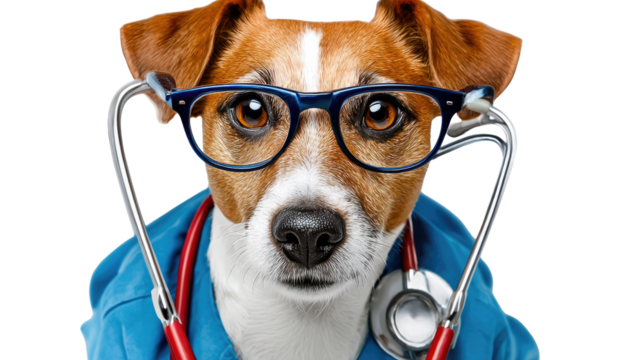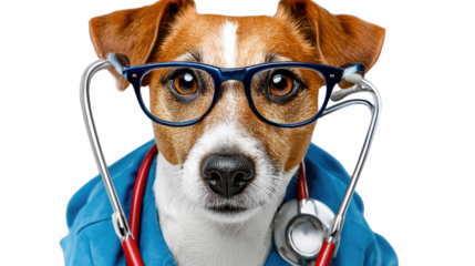 Canine Caregiver: A Jack Russell Terrier is the embodiment of medical precision, dressed in scrubs with spectacles and a stethoscope, exuding competence.