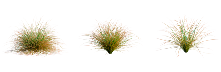 Carex testacea tree, front view, cutout, transparent background, isolate, architecture visualization, Three clumps of vibrant green and golden prairie grass on a neutral background