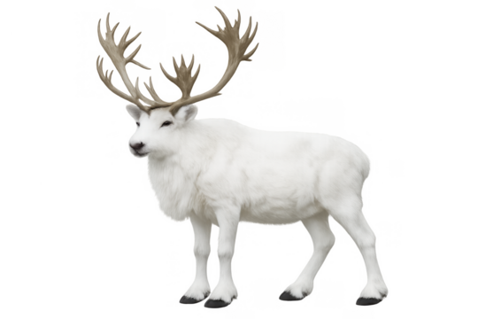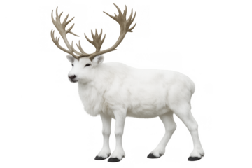 White reindeer standing, showing its unique fur and large antlers, a symbol of arctic wildlife and winter wilderness