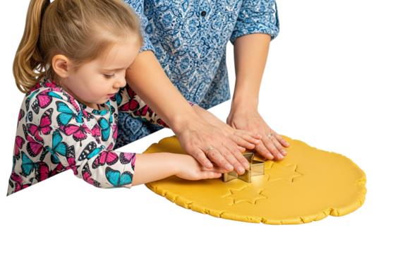 A caring mother and her little daughter share a special moment baking together, their hands joined as they carefully cut star shapes from dough against a black background
