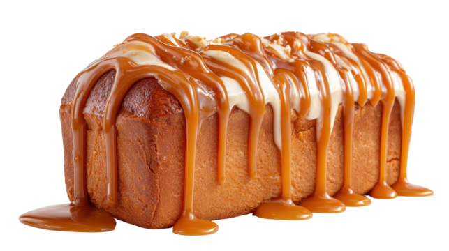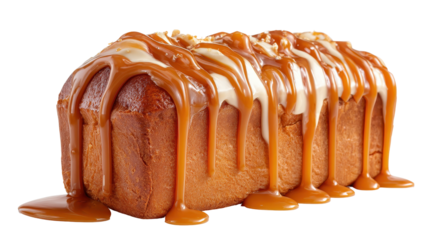 Delicious loaf of cake drizzled with caramel sauce. transparent background