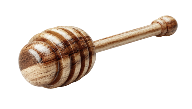 Wooden honey dipper with round grooved end, angled on a black background
