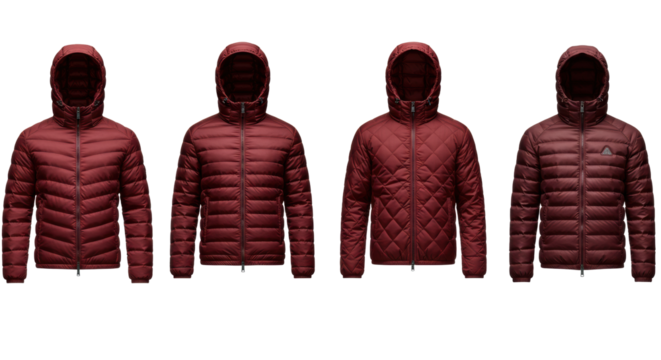 four distinct, high-loft cardinal red puffer jackets, featuring varied quilting and hardware, professionally rendered on a transparent e-commerce background. concept for luxury outerwear advertising