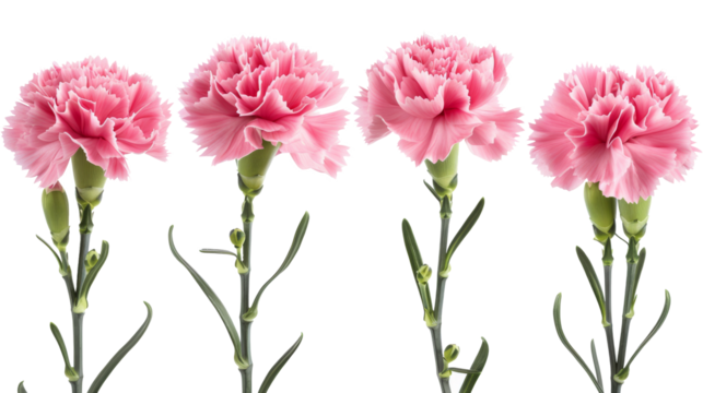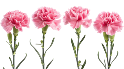 Four pink carnation flowers with green stems elegantly arranged against a white background