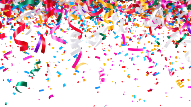 Colorful confetti and serpentine ribbons falling from above isolated on transparent