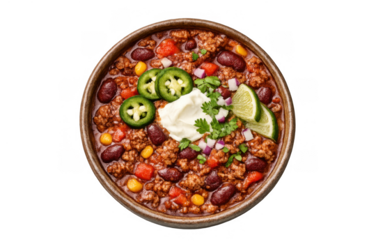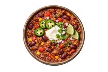 Spicy chili con carne serving in a ceramic bowl, garnished with fresh ingredients. Transparent background