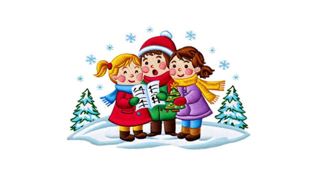 Children singing Christmas carols in snow on transparent background