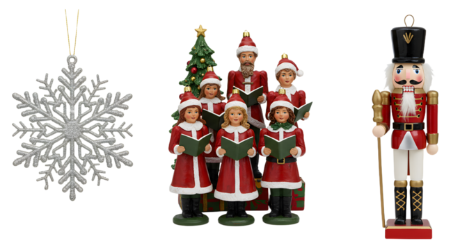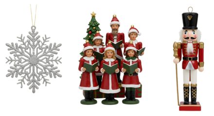 Christmas carolers decoration with nutcracker and snowflake ornament isolated on white, festive Xmas holiday decor, perfect for seasonal displays