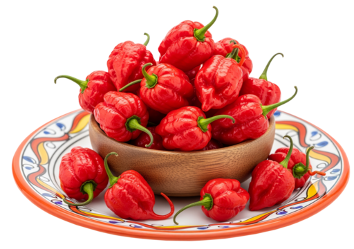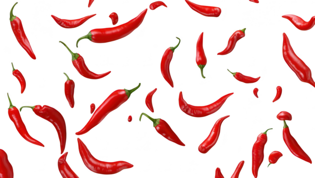A arrangement of various red chili peppers scattered across a transparent background. their shapes and sizes. ideal for culinary themes or spice-related content