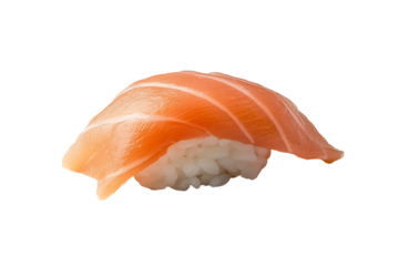 Delicious sushi with fresh salmon slices on a bed of rice, isolated on a white background.
