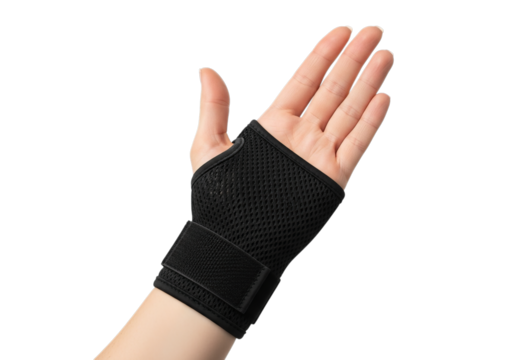 Human hand wearing a wrist brace for support and recovery isolated on transparent background