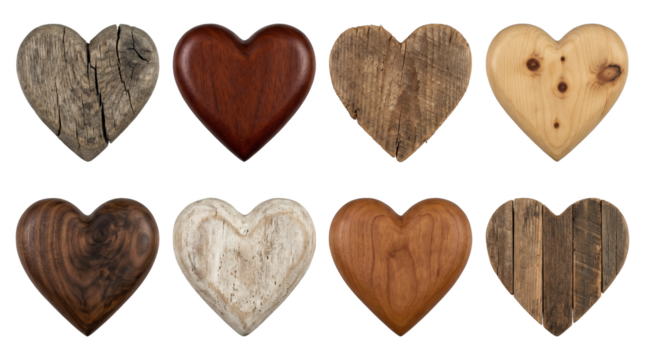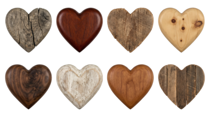 Wooden heart set including carved, rustic, weathered, polished, and grain textured varieties isolated. Decorative craft and romantic symbol collection.