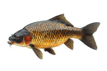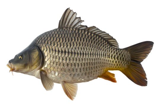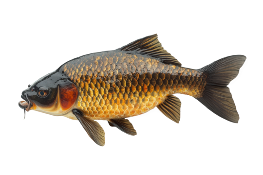 SIngle whole carp fish. The fish showcasing its sleek, curved body, shimmering golden-brown scales, detailed fins, and natural textures isolated on white background. PNG file