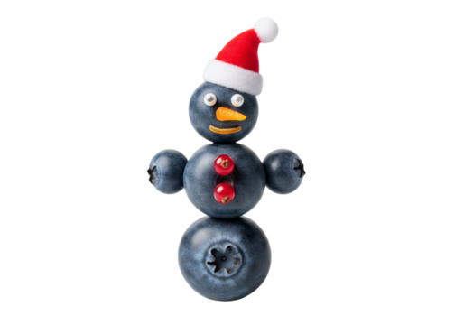 Festive Blueberry Snowman Isolated on White Healthy Holiday Fun Food Art