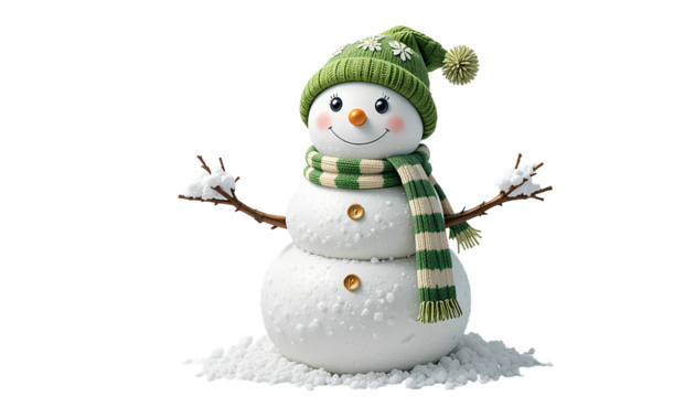 Cute snowman decoration with green knitted hat and scarf isolated on transparent background