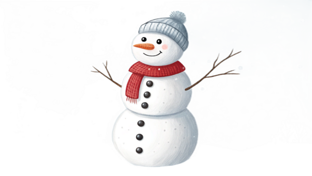Cheerful snowman with a carrot nose, twig arms, coal eyes, and a joyful smile, isolated on white background, perfect for winter themes, holiday cards, seasonal decorations, and illustrations