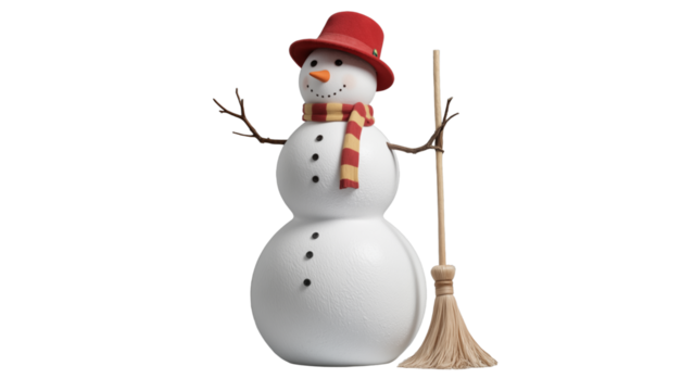 Cheerful snowman with hat, striped scarf, carrot nose, branch arms, and broom, classic winter character on white background symbolizing joy, holiday spirit, and festive charm.