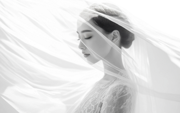 Transparent image of upset bride sitting thoughtfully in wedding dress