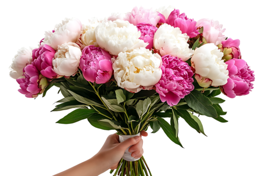 A hand delicately holds a vibrant bouquet of pink roses and peonies, showcasing a beautiful floral arrangement.