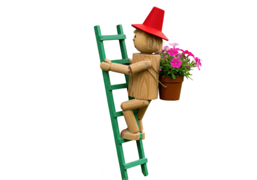 Wooden figure climbing ladder with flower pot isolated on transparent background